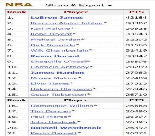 此役过后,威少在NBA历史得分榜上连续超越绿军两位名宿哈弗里切克和保罗-皮尔斯升至历史第18位。目前排在威少身前的是马刺传奇蒂姆-邓肯。