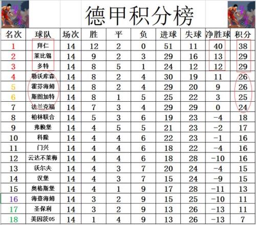 积分榜方面,第14轮战罢,拜仁领先第2的莱比锡,第3的多特9分,拜仁净胜球多了27球之多,可以说是提前3轮锁定了半程冠军。争4很激烈,斯图加特今天大胜追上来,只差第4的勒沃库森1分。